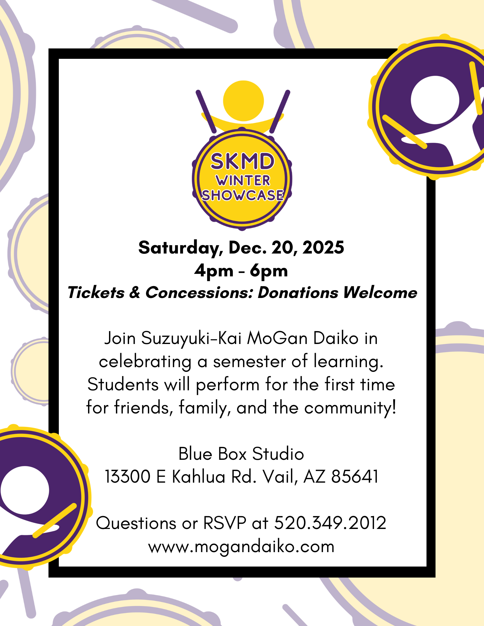 SKMD has been teaching taiko, traditional Japanese drumming, and nihon buyo, traditional Japanese dancing, for over 40 years here in Southern Arizona. The age ranges we have taught over the years include students age 3 through their mid 90s. We are able to have such a robust student makeup because we believe in the core principles of inclusivity, adaptive teaching, and having fun.